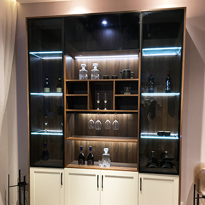 既然是定制酒柜,當(dāng)然首先應(yīng)該體現(xiàn)出“量身定制”的優(yōu)勢。設(shè)計(jì)師應(yīng)先與業(yè)主溝通,將酒柜的放置位置確定好,之后再將該位置的面積、高度、形狀做出精確的測量,并將具體數(shù)據(jù)提供給的制造工段,這樣才能保證酒柜的尺寸合適。